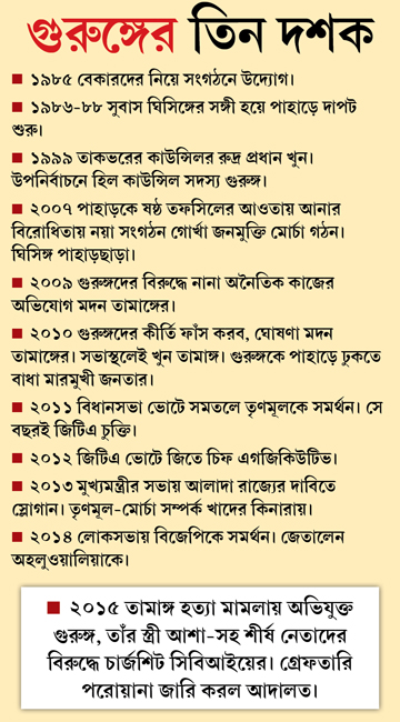 আজ, রবিবার দার্জিলিঙের ভানু ভবনে বৈঠক করার কথা জিটিএ-র। গুরুঙ্গ সরে গেলে দল ও জিটিএ-র দায়িত্ব কার হাতে থাকবে, তা নিয়ে সেখানে আলোচনা হওয়ার কথা। তবে ওই বৈঠকে চার্জশিট-প্রাপ্ত কোনও জিটিএ সদস্য থাকবেন না। দলের কেন্দ্রীয় কমিটির এক নেতা জানান, যাঁদের হাতে রাশ তুলে দেওয়া হতে পারে বলে শোনা যাচ্ছে, তাঁদের মধ্যে এগিয়ে কার্শিয়াঙের নির্বাচিত সদস্য অনিত থাপা। কারণ, দলের রাজনৈতিক ও অর্থনৈতিক দিক পরিচালনার ব্যাপারে অনিতবাবুর উপরেই গুরুঙ্গ অত্যন্ত নির্ভর করেন।