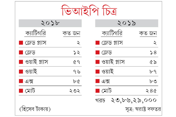 নিরাপত্তা পর্যালোচনা কমিটি সূত্রের খবর, ২০১৮-তে রাজ্যে ‘সরকারি ভিআইপি’ ছিলেন ২৩২ জন। ২০১৯-এ সংখ্যাটা ২৪৫। বাম আমলে এই তালিকায় ছিলেন শ’খানেকের কিছু বেশি ব্যক্তি। যাঁদের অধিকাংশই মন্ত্রী, কনসাল জেনারেল, বিচারপতি, সিনিয়র আমলা এবং মাওবাদী এলাকার জনপ্রতিনিধি। স্বরাষ্ট্র কর্তারা জানাচ্ছেন, ২০১৮-১৯ অর্থবর্ষে রাজ্যের এক জন ভিআইপি’র নিরাপত্তা দিতে গড়ে খরচ হত ৮ লক্ষ ৯৪ হাজার টাকা। এ বছর তা বেড়ে হয়েছে ৯ লক্ষ ৭৪ হাজার টাকা। স্বরাষ্ট্র দফতর সূত্রের খবর, ভিআইপি-দের নিরাপত্তা খাতে ২০১৮-তে সব মিলিয়ে রাজ্যের খরচ ছিল ২০ কোটি ৭৩ লক্ষ ৩২ হাজার টাকা। ২০১৯ সালে তা-ই হয়েছে ২৩ কোটি ৮৬ লক্ষ ২৯ হাজার টাকা।