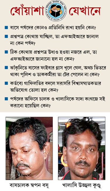 প্রশ্ন এখানেই। যদি পুলিশ ও ডাককর্মীরা বাসে থাকাকালীনই প্রশ্নপত্র উধাও হয়ে গিয়ে থাকে, তবে কেন শুধু বাসের চালক ও খালাসিকে দিয়ে সাদা কাগজে সই করানো হল? এটা কি কাউকে আড়াল করতে?
