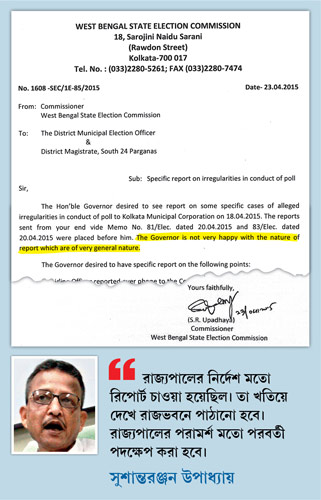 কলকাতা পুরভোটে শাসক তৃণমূলের বিরুদ্ধে সন্ত্রাস-ছাপ্পা-রিগিং-বুথ দখল নিয়ে ভূরি ভূরি অভিযোগ করেছিল বিরোধী দলগুলি। শাসক দল সে সব অভিযোগ উড়িয়ে দিলেও বিষয়টি নজর এড়ায়নি রাজ্যপালের। এ নিয়ে তিনি নির্বাচন কমিশনারের কাছে রিপোর্ট তলব করেন। ভোটের গোলমাল নিয়ে কলকাতা পুর নির্বাচনী আধিকারিক তথা দক্ষিণ ২৪ পরগনার জেলাশাসক শান্তনু বসু যে দু’টি রিপোর্ট কমিশনে পাঠিয়েছিলেন, তা গত ২২ এপ্রিল রাজ্যপালের কাছে জমা দেন নির্বাচন কমিশনার। কিন্তু ওই রিপোর্ট দেখে কেশরীনাথ শুধু ক্ষুব্ধ হননি, সমস্ত অভিযোগ সম্পর্কে ফের নির্দিষ্ট রিপোর্ট তলব করেন।