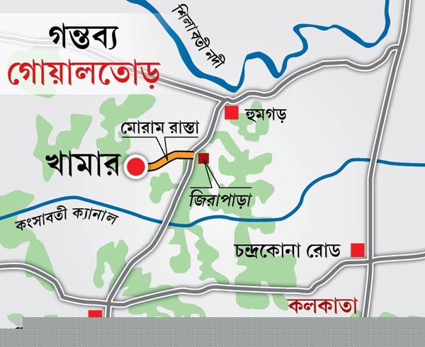 • গোয়ালতোড় থেকে হুমগড়ের দিকে প্রায় ৬০ ফুট চও়়ড়া (২২ ফুট পিচ রাস্তা ও দু’পাশের মোরাম-সহ) ১২ কিলোমিটার রাস্তা ধরে গেলে জিরাপাড়া মোড়। সেখানে থেকে বাঁ দিকে আরও আড়াই কিলোমিটার মোরাম রাস্তা গেলে পড়বে বীজ খামার