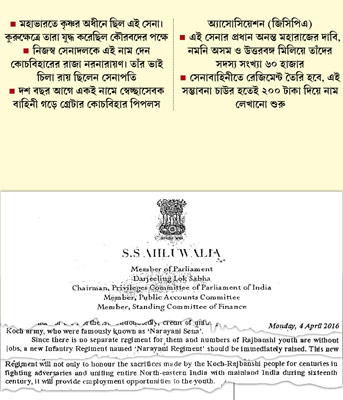প্রায় দশ বছর ধরে নিঃশব্দে সদস্য সংগ্রহ করে ‘নারায়ণী সেনা’ নামে মস্ত একটি বাহিনী গড়ে ফেলেছে গ্রেটার কোচবিহার পিপলস অ্যাসোসিয়েশন (জিসিপিএ)। এ বার সেই দলে নাম লেখাতে লাইন পড়ে গিয়েছে। কারণ, কোচবিহার জুড়ে চাউর হয়ে গিয়েছে, নারায়ণী সেনা এ বার ভারতীয় সেনাবাহিনীতে নতুন রেজিমেন্ট হিসেবে যোগ দিতে চলেছে। এই প্রচারের পিছনে রয়েছে কেন্দ্রীয় স্বরাষ্ট্রমন্ত্রীকে লেখা দার্জিলিং সাংসদ সুরেন্দ্র সিংহ অহলুওয়ালিয়ার একটি চিঠি। বিষয়টি জানার পরে নড়েচড়ে বসেছে রাজ্য প্রশাসন। তাদের আশঙ্কা, এই দাবিকে কেন্দ্র করে নতুন অশান্তির মেঘ ঘনাতে পারে অসম ও বাংলাদেশ সংলগ্ন এই জেলায়।