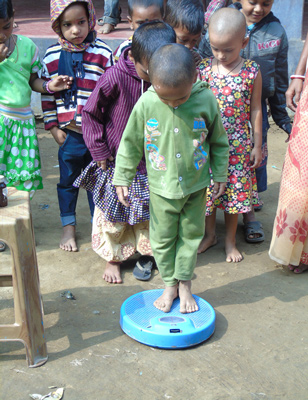 মন্দিরবাজারে শিশুদের ওজন মাপা হচ্ছে।