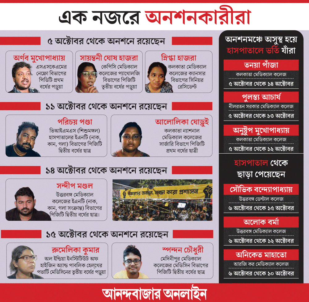 ১১ অক্টোবর থেকে অনশন করছেন কলকাতা ন্যাশনাল মেডিক্যাল কলেজের সার্জারি বিভাগের পিজিটি অলোলিকা এবং ভিআইএমএস (শিশু মঙ্গল) হাসপাতালের ইনএনটি (নাক, কান, গলা) বিভাগের পিজিটি দ্বিতীয় বর্ষের ছাত্র পরিচয়। জুনিয়র ডাক্তারদের সূত্রে জানা গিয়েছে, দু’জনেই দুর্বল হয়ে পড়েছেন। মাঝেমধ্যেই ‘ক্র্যাম্প’ ধরছে পেশিতে। যন্ত্রণা হচ্ছে শরীরে। তবু মনের জোরে আন্দোলন চালিয়ে যেতে চাইছেন তাঁরা। ১৫ অক্টোবর থেকে অনশন করছেন অল ইন্ডিয়া ইনস্টিটিউট অফ হাইজিন অ্যান্ড পাবলিক হেল্থের পভার্টি মেডিসিনের তৃতীয় বর্ষের পড়ুয়া রুমেলিকা এবং মেদিনীপুর মেডিক্যাল কলেজের পিজিটি দ্বিতীয় বর্ষের ছাত্র স্পন্দন। তাঁদের শরীরের অবস্থাও একই রকম। ক্রমে দুর্বল হয়ে পড়ছেন তাঁরা।