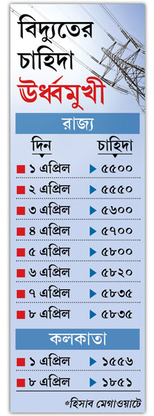 তাপমাত্রার সঙ্গে পাল্লা দিয়ে বাড়ছে বিদ্যুতের চাহিদাও। বিদ্যুৎ দফতর সূত্রের খবর, রাজ্য বিদ্যুৎ বণ্টন সংস্থার এলাকায় ১ এপ্রিল চাহিদা ছিল ৫৫০০ মেগাওয়াট। দিন কয়েকের মধ্যেই তা ৫৮০০ মেগাওয়াট ছাড়িয়েছে। সিইএসসি এলাকায় ৮ এপ্রিল বিদ্যুতের চাহিদা ছিল ১৮৫১ মেগাওয়াট।