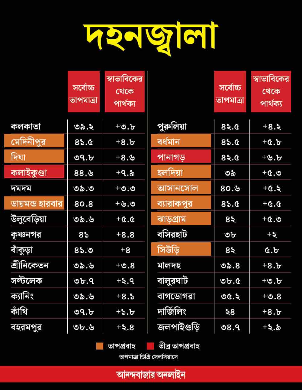 শুক্রবার হলদিয়া, মগরা, আসানসোল, বর্ধমান, ব্যারাকপুর, ঝাড়গ্রাম, সিউড়িতে চলেছে তাপপ্রবাহ। কলাইকুন্ডা, পানাগড়ে চলেছে তীব্র তাপপ্রবাহ। রাজ্যে সব থেকে বেশি গরম ছিল পশ্চিম মেদিনীপুরের কলাইকুন্ডাতেই। সেখানে সর্বোচ্চ তাপমাত্রা ছিল ৪৪.৬ ডিগ্রি সেলসিয়াস। স্বাভাবিকের থেকে ৭.৯ ডিগ্রি সেলসিয়াস বেশি। তার পরেই রয়েছে পানাগড়। সেখানে সর্বোচ্চ তাপমাত্রা ছিল ৪২.৫ ডিগ্রি সেলসিয়াস। একই তাপমাত্রা শুক্রবার ছিল পুরুলিয়াতেও। ঝাড়গ্রাম এবং সিউড়িতেও দিনের তাপমাত্রা ছিল ৪২ ডিগ্রি সেলসিয়াস। ৪১ ডিগ্রির গণ্ডি ছাড়িয়েছিল বাঁকুড়া, বর্ধমান, ব্যারাকপুর, কৃষ্ণনগর, মেদিনীপুর। ডায়মন্ড হারবার ছাড়াও ৪০ ডিগ্রি সেলসিয়াসের উপর দিনের তাপমাত্রা ছিল মগরা, আসানসোলে।