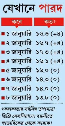 আবহবিদদের পর্যবেক্ষণ, যে-ভাবে আবহাওয়ার মতি বদলাচ্ছে, তাতে পৌষ-সংক্রান্তিতে কলকাতায় সর্বনিম্ন তাপমাত্রা ১২ ডিগ্রি সেলসিয়াসের কাছাকাছি ঘোরাফেরা করবে। পশ্চিমাঞ্চলের জেলাগুলির কোথাও কোথাও ১০ ডিগ্রির নীচেও নেমে যেতে পারে পারদ।