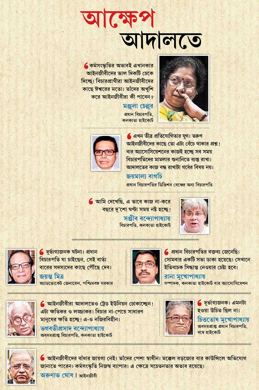 গোটা ঘটনাপ্রবাহে আইনজ্ঞদের একাংশও বীতশ্রদ্ধ। কলকাতা হাইকোর্টের অবসরপ্রাপ্ত বিচারপতি ভগবতীপ্রসাদ বন্দ্যোপাধ্যায় বা বম্বে হাইকোর্টের অবসরপ্রাপ্ত প্রধান বিচারপতি চিত্ততোষ মুখোপাধ্যায় আইনজীবীদের গরহাজিরার কঠোর সমালোচনা করেছেন। ভগবতীবাবু এ-ও বলছেন, “মনে রাখতে হবে, আইনজীবী ছাড়াও বিচারপ্রার্থী সওয়াল করতে পারেন।” আবার হাইকোর্টের আইনজীবী অরুণাভ ঘোষের অভিমত, স্বাধীন পেশায় লোকে যে হেতু ইচ্ছে মতো কাজ করতে পারেন, তাই এ ক্ষেত্রে সামাজিক সচেতনতার প্রশ্নটাই মুখ্য।