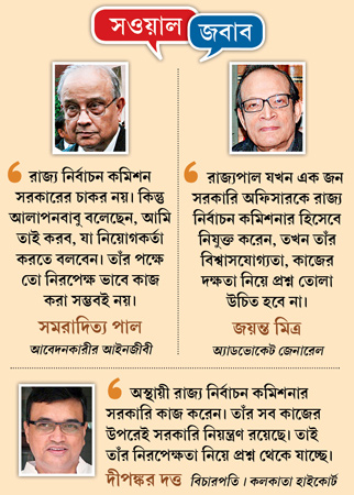 রাজ্য সরকার কেন স্থায়ী নির্বাচন কমিশনার নিয়োগ না করে অস্থায়ী কমিশনার নিয়োগ করল, সেই প্রশ্ন এ বার তুলল কলকাতা হাইকোর্টও। অস্থায়ী নির্বাচন কমিশনার আলাপন বন্দ্যোপাধ্যায়ের নিরপেক্ষতা নিয়েও প্রশ্ন তুলে শুক্রবার বিচারপতি দীপঙ্কর দত্ত বলেন, ‘‘অস্থায়ী রাজ্য নির্বাচন কমিশনার এখনও সরকারি অফিসার। তাঁর সব কাজের উপরেই সরকারি নিয়ন্ত্রণ রয়েছে। তাই তাঁর নিরপেক্ষতা নিয়ে প্রশ্ন তোলার অবকাশ থাকেই।’’