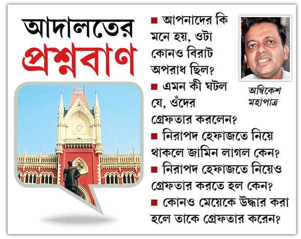 এ বারের প্রসঙ্গ ব্যঙ্গচিত্র-কাণ্ড। তিন বছর আগের ওই ঘটনায় যাদবপুর বিশ্ববিদ্যালয়ের শিক্ষক অম্বিকেশ মহাপাত্র ও তাঁর পড়শি সুব্রত সেনগুপ্তকে গ্রেফতারের আইনি বৈধতা নিয়ে বৃহস্পতিবার প্রশ্ন তুলেছে কলকাতা হাইকোর্ট। উত্তরে সরকারপক্ষ এমন কথা বলেছে, যার পরের ধাপের ব্যাখ্যা তারাই প্রধান বিচারপতির ডিভিশন বেঞ্চকে জুগিয়ে উঠতে পারেনি। ফলে পুলিশ তথা সরকারের বিড়ম্বনাই বেড়েছে।