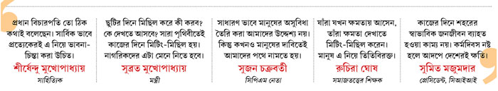 পরিস্থিতি কিন্তু বদলায়নি। বিভিন্ন সময়ে বারবার কাজের দিনেই মিটিং-মিছিল করে শহরে যানজট ও নাগরিক দুর্ভোগ সৃষ্টি করে রাজনৈতিক দলগুলির ক্ষমতার প্রদর্শন চলেছে। সোমবার জনস্বার্থে দায়ের হওয়া একটি মামলার প্রেক্ষিতে কলকাতা হাইকোর্টের প্রধান বিচারপতি মঞ্জুলা চেল্লুর বলেন, ‘‘কাজের দিনে রাস্তায় মিটিং-মিছিল হওয়াটা অনভিপ্রেত। সব রাজনৈতিক দলগুলিকেই এ নিয়ে চিন্তাভাবনা করতে হবে।’’