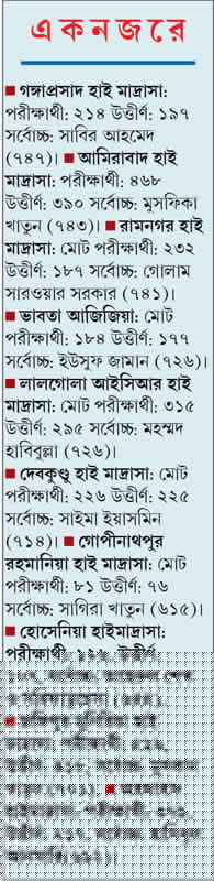 ৭৪৭ পেয়ে রাজ্যের মধ্যে দ্বিতীয় হয়েছে দৌলতবাদের গঙ্গাপ্রসাদ হাই মাদ্রাসার সাবির আহমেদ। চতুর্থ হয়েছে রানিনগরের আমিরাবাদ হাই মাদ্রাসার ছাত্রী মুস্তিকা খাতুন। তার প্রাপ্ত নম্বর ৭৪৩। ৭৪১ নম্বর পেয়ে রাজ্যের মধ্যে পঞ্চম হয়েছে রামনগর হাই মাদ্রাসার গোলাম সারওয়ার সরকার। রাজ্যের মধ্যে যুগ্ম ভাবে দশম হয়েছে জেলার দুই ছাত্র। ভাবতা আজিজিয়া হাই মাদ্রাসার মহম্মদ ইউসুফ জামান এবং লালগোলা আইসিআর হাই মাদ্রাসার মহম্মদ হাবিবুল্লা—যুগ্ম ভাবে দশম হয়েছে। দু’জনেরই প্রাপ্ত নম্বর ৭২৬।