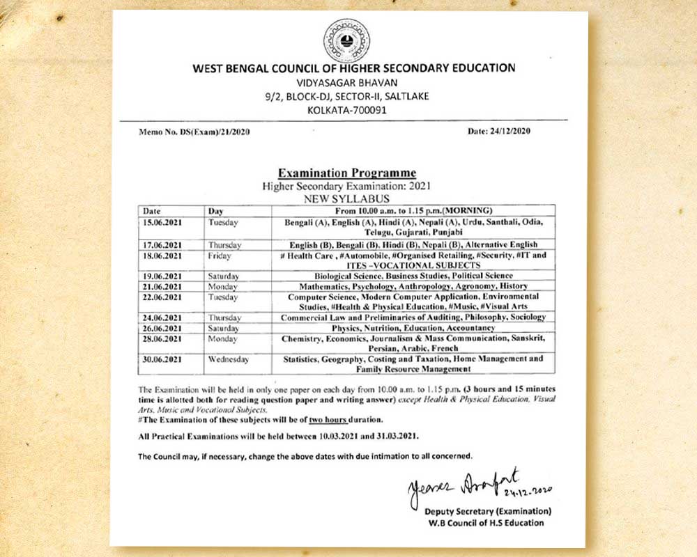 আগামী বছরে উচ্চমাধ্যমিকের সময়সূচি ঘোষণা হল। পরীক্ষা শুরু হচ্ছে ১৫ জুন থেকে। লিখিত পরীক্ষা চলবে ৩০ জুন পর্যন্ত। ব্যবহারিক (প্রাক্টিক্যাল) পরীক্ষা ১০ থেকে ৩০ মার্চের মধ্যে নিতে হবে স্কুলগুলিকে। পরীক্ষার দিনগুলিতে করোনার নিয়ম বিধির বিষয়ে স্কুলগুলিকে দায়িত্ব নিতে হবে বলে জানিয়েছে উচ্চমাধ্যমিক শিক্ষা সংসদ। সকাল ১০টা থেকে দুপুর ১টা ১৫ পর্যন্ত লিখিত পরীক্ষা হবে। একই সঙ্গে হবে একাদশের পরীক্ষাও। ১৫ জুন থেকে শুরু হয়ে শেষ হবে ২ জুলাই। পরীক্ষা হবে বেলা ২টো থেকে ৫টা ১৫ পর্যন্ত।