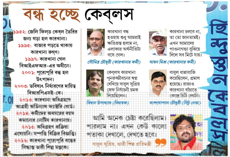 ফোনের জন্য ‘জেলি ফিল্ড কেব্ল’ তৈরি করতে ১৯৫২ সালে রূপনারায়ণপুরে গড়া হয় হিন্দুস্তান কেব্লস। কিন্তু বাজারে ‘অপটিক্যাল ফাইবার কেব্ল’ চলে আসার পর থেকে কারাখানাটি ধুঁকতে শুরু করে। ২০০১ সালে উৎপাদন একেবারে বন্ধ করে দেওয়া হয়। দু’বছর পরে কারখানার ভাগ্য নির্ধারণের দায়িত্ব যায় রাষ্ট্রায়ত্ত সংস্থা পুনরুজ্জীবন বোর্ডের (বিআরপিএসই) হাতে।
