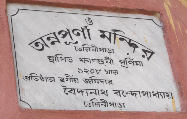 গঙ্গা বেশ কিছুটা দূরে সরে গিয়েছে। সুন্দর, প্রাচীন স্থাপত্যের জমিদারবাড়ি বহন করে চলেছে দেবত্রের বোঝা। অদূরেই মন্দির। তাতে রূপোর শিব, অষ্টধাতুর অন্নপূর্ণা। প্রবেশপথের পাশে এবং ভিতরের দেওয়ালে শ্বেতপাথরের ফলকে লেখা বাংলা ১২০৮-এ প্রতিষ্ঠা। সঙ্গে খোদাই ‘প্রতিষ্ঠাতা বর্গীয় জমিদার বৈদ্যনাথ বন্দ্যোপাধ্যায়’। দু’টি হাড়িকাঠ। একটি মোষের, অন্যটি পাঁঠার। পশুবলি বন্ধ হয়ে গেলেও ওগুলো রয়ে গিয়েছে অতীতের ঐতিহ্য হিসাবে। পুজোয় অবশ্য ও দু’টো পূজিত হয়। সিঁদুর চড়ে হাড়িকাঠে।