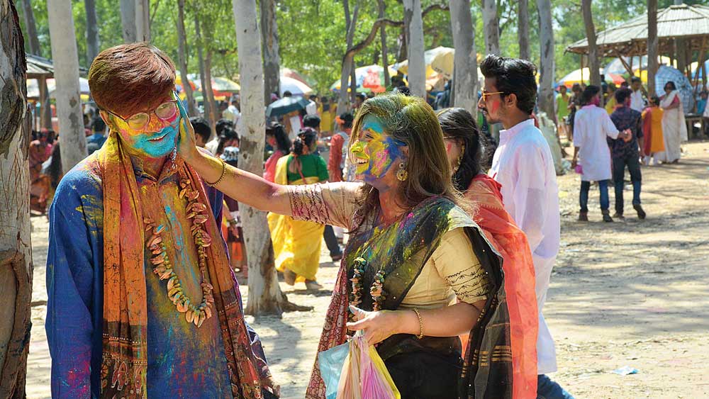 শান্তিনিকেতন দেখতে এসেও ক্যাম্পাস চত্বরে প্রবেশ করতে না পেরে পর্যটকেরা ভিড় জমান সোনাঝুরিতে। সেখানে জড়ো হয়েছিলেন বিশ্বভারতীর অনেক ছাত্র-ছাত্রীও। সেখানেই পর্যটক ও পড়ুয়ারা দোল খেলায় মেতে উঠে দুধের স্বাদ ঘোলে মেটান। আসপাশের রিসোর্টগুলির উদ্যোগেও সেখানে আবির খেলা, বাউল গানের আয়োজন করা হয়েছিল। কলকাতা থেকে আসা পর্যটক বললেন, ‘‘হোটেল বুকিং বাতিল না করে চলেই এসেছি। ক্যাম্পাসে ঢুকতে না পেরে সোনাঝুরিতে এসেই নিজেদের মতো করে দোলের আনন্দে শামিল হয়েছি।’’