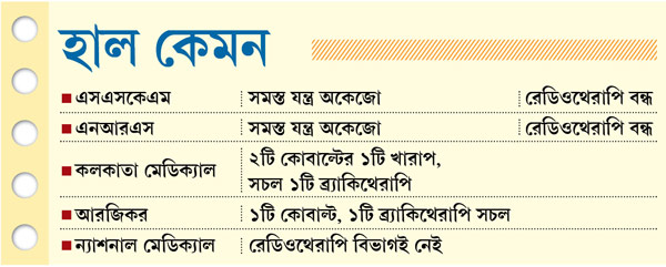 এসএসকেএমে বন্ধ। ন্যাশনালে বিভাগই নেই। এ বার নীলরতন সরকারেও যন্ত্র অকেজো হয়ে গেল। ভরসা শুধু কলকাতা মেডিক্যাল আর আরজিকরের টেলিথেরাপি ও ব্র্যাকিথেরাপি-র একটি করে যন্ত্র। ক্যানসারের চিকিৎসা করাতে এসে হাপিত্যেশ করে বসে থাকা মানুষের সংখ্যা ক্রমশ বাড়ছে এ রাজ্যে।যেমন বাঁকুড়ার শালতোড়ার আবুল শেখ। মাসে অন্তত দু’বার একে-তাকে ধরে জেলা থেকে কলকাতার বিভিন্ন মেডিক্যাল কলেজে ঘুরতে গিয়ে নাভিশ্বাস উঠছে তাঁর। ক্যানসার রোগী আবুল রাজ্যের সরকারি হাসপাতাল থেকে নিখরচায় কেমোথেরাপি পেয়েছেন। ডাক্তারবাবুরা জানিয়েছিলেন, পরের ধাপেই রেডিওথেরাপি দরকার।