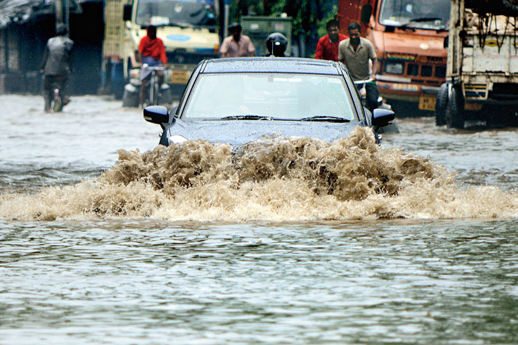 বেনারস রোডে জল ঠেলে যাতায়াত। শনিবার। ছবি: দীপঙ্কর মজুমদার
