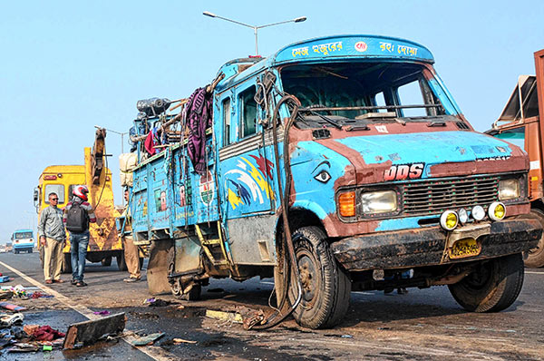 দু’ই জেলায় দুর্ঘটনায় মৃত্যু হল এক জনের। জখম হয়েছেন ৫৮ জন। শুক্রবার সকাল সাড়ে ৭টা নাগাদ একটি দুর্ঘটনা ঘটেছে হাওড়ার বীরশিবপুরে মুম্বই রোড়ে। পুলিশ জানায়, মৃতের নাম রাজু মণ্ডল (৩২)। বাড়ি দক্ষিণ ২৪ পরগনার কাকদ্বীপের কামারহাটে। পুলিশ ও স্থানীয় সূত্রে জানা গিয়েছে, কামারহাটের একটি যাত্রাদলের ২২ জন সদস্য মিনি ট্রাকে করে পূর্ব মেদিনীপুরের পটাশপুরে যাচ্ছিলেন অনুষ্ঠান করতে। ট্রাকটি তাঁদেরই। সঙ্গে ছিল যাত্রার সরঞ্জামও। সেতুতে ওঠার সময়ে হঠাৎ ট্রাকটির সামনের ডান দিকের চাকা ফেটে যায়। নিয়ন্ত্রণ হারিয়ে রেলিং-এ ট্রাকটি ধাক্কা মারে। জিনিসপত্র-সহ আরোহীরা রাস্তার উপরে ছিটকে পড়েন। রাজু-সহ ১৮ জন আহত হন। পুলিশ তাঁদের উদ্ধার করে উলুবেড়িয়া মহকুমা হাসপাতালে নিয়ে যায়। সেখানে রাজুকে মৃত বলে ঘোষণা করেন চিকিৎসকেরা। পাঁচজন চিকিৎসাধীন। বাকিদের প্রাথমিক চিকিৎসার পরে ছেড়ে দেওয়া হয়। ট্রাকের চাকাগুলির অবস্থা খুব খারাপ বলে জানা গিয়েছে।