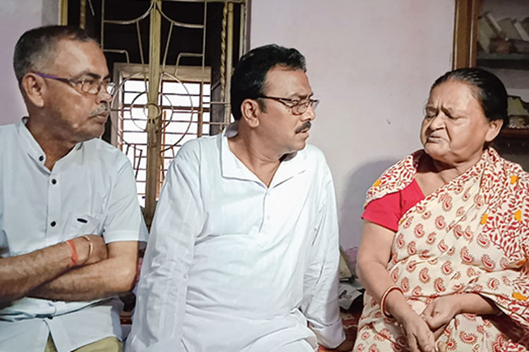 আলোচনা: নিহতের বাবা-মায়ের সঙ্গে কথা বলছেন উত্তরপাড়ার পুরপ্রধান দিলীপ যাদব। নিজস্ব চিত্র