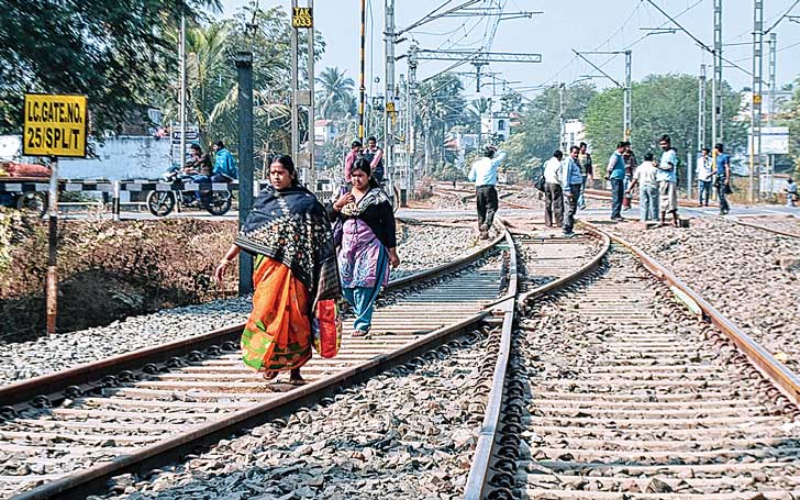 জীবনের ঝুঁকি নিয়ে এমন বিপজ্জনক ভাবেই নিত্য রেললাইন ধরে যাতায়াত করেন এলাকার মানুষ। তারকেশ্বরে মোহন দাসের ছবি।