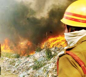 আগুন নেভানোয় ব্যস্ত দমকলকর্মীরা। —নিজস্ব চিত্র।