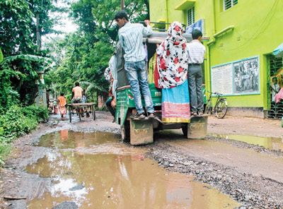 বেহাল বাগনানের নুনটিয়া থেকে গদাইপুর রাস্তায় প্রাণান্তকর যাত্রা। ছবি: সুব্রত জানা।