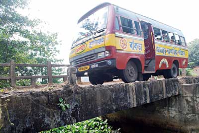 সেতুর রেলিং ভেঙে গিয়েছে। তার উপর দিয়েই বিপজ্জনক ভাবে চলাচল করছে যানবাহন। ছবি: রমাপ্রসাদ গঙ্গোপাধ্যায়।