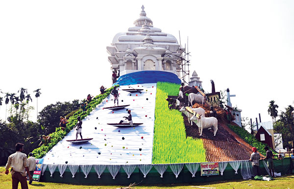 মিলন পল্লি নটরাজ পূজা কমিটি: থিম, ‘বাংলার মুখ’। মডেলের মাধ্যমে খেত, কারখানা এবং চা-বাগানে কাজের দৃশ্য ফুটিয়ে তোলা হয়েছে।