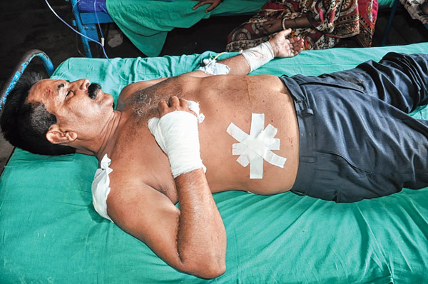 হাসপাতালে জখম অবসরপ্রাপ্ত পুলিশকর্মী। ছবি: তাপস ঘোষ।