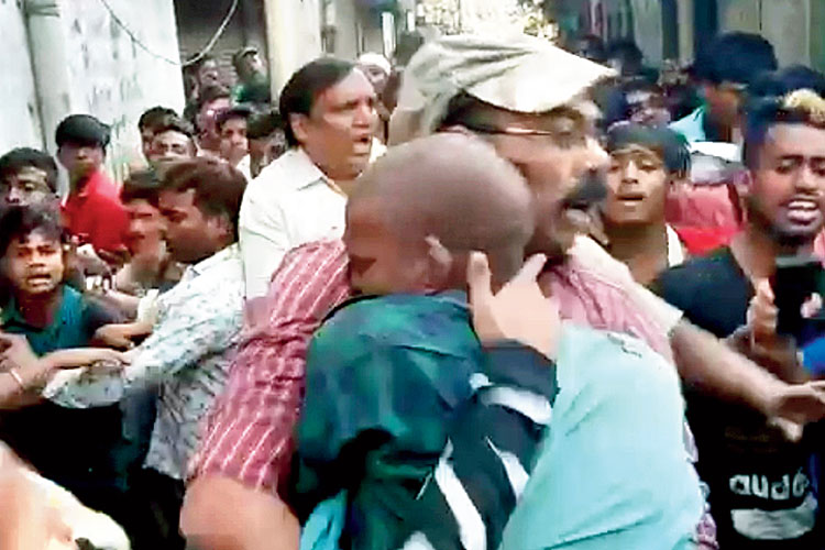 বেলুড়ে উত্তেজিত জনতার হাত থেকে সতীশ কুমারকে ছাড়িয়ে নিয়ে যাচ্ছে পুলিশ।