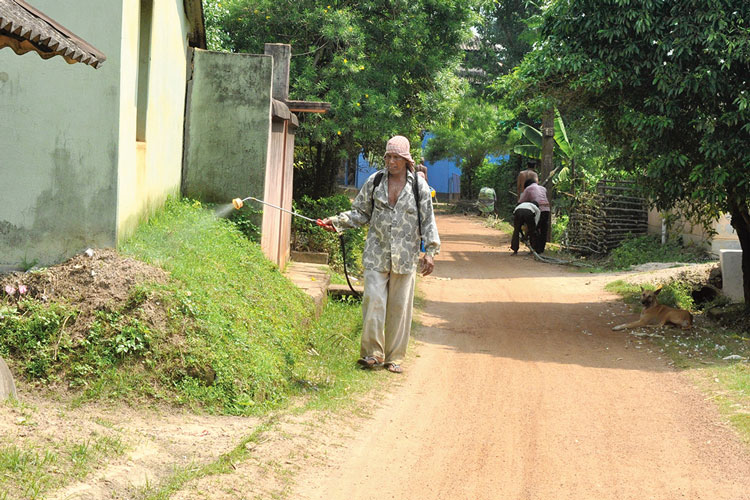 শনিবার সকালে এলাকায় কীটনাশক স্প্রে করা হচ্ছে। ছবি: মোহন দাস