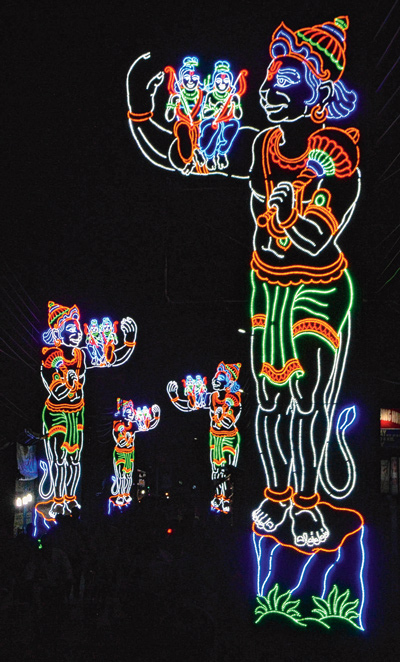 রাস্তা ধরে এগোলেই একের পর এক আলোক ম্যাজিক। উদির্বাজার, বোরোকালীতলা, বোরোচাঁপাতলা ধরে লক্ষ্মীগঞ্জ বাজার এলাকা দিয়ে জিটি রোডে পড়তেই আলোয় চোখ ধাঁধিয়ে গেল। কোনটা ছেড়ে কোনটায় চোখ রাখবেন দর্শনার্থীরা। আদতে বড় বড় কাটআউট আর ফ্রেমে বাঁধানো আলোকমালা চন্দননগরের আলোর ঐতিহ্য। শ্রীধরের হাত ঘুরে এখনকার বাবু পালেরা সেই ঐতিহ্যের উত্তরসূরী। তার সঙ্গে গত কয়েক বছরে যোগ হয়েছে কালো ফ্রেমের মধ্যে বড় বড় এলইডি আলোর বোর্ড। হাল আমলে থিমের পুজো নিয়ে মাতামাতির যে ঢল কলকাতায় আছড়ে পড়েছে তার ছোঁয়া আগেই লেগেছে এখানে। প্রতিমায় সাবেক টান বজায় রাখার চেষ্টা হলে মণ্ডপে এবং আলোয় থিমের সগর্ব উপস্থিতি। যা চন্দননগরের জগদ্ধাত্রীকে অন্য মাত্রায় নিয়ে গিয়েছে।