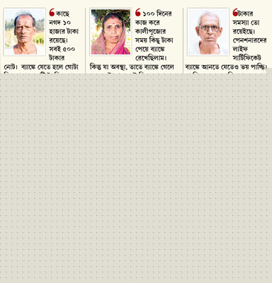 নোট বাতিলের ধাক্কায় বন্ধ হতে বসেছে চাষবাস ও ছোট দোকান। পেনশনভোগীরা টাকা তুলতে যেতে পারছেন না দূরত্ব এবং ভিড়ের জন্য। মেয়ের বিয়ে কী ভাবে দেবেন তা নিয়ে দুশ্চিন্তায় পড়েছেন চাষিরা।