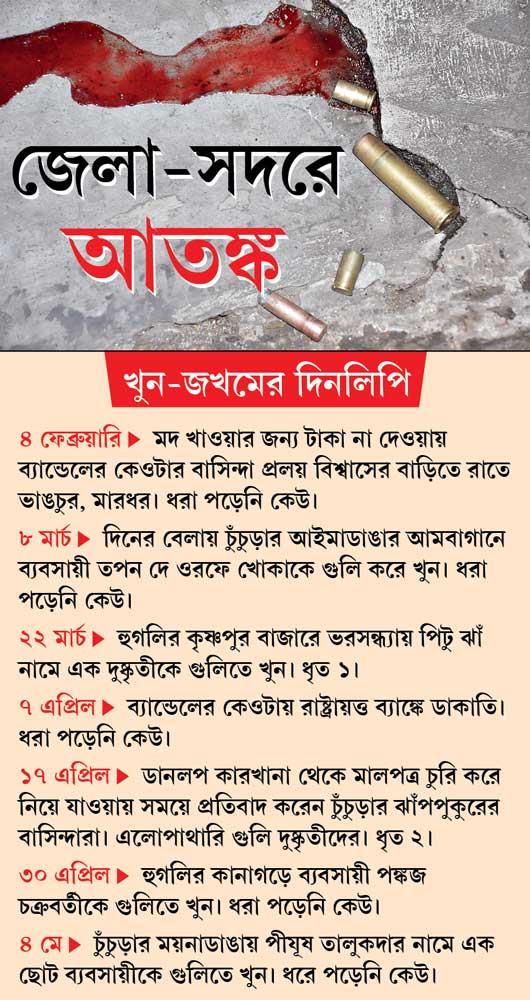 গত মার্চেই স্টেশন লাগোয়া আইমাডাঙা আমবাগানের মধ্যে স্থানীয় ব্যবসায়ী তপন দে ওরফে খোকাকে দিনের আলোয় গুলি করে খুন করা হয়। তদন্তে নেমে চারজনকে গ্রেফতার করে পুলিশ। কিন্তু কেন খুন, তা নিয়ে এখনও ধন্দে পুলিশ। তপনের ঘটনার রেশ মিলিয়ে যাওয়ার আগেই ফের খুন। এ বার হুগলি স্টেশন লাগোয়া কৃষ্ণপুর বাজারে। ভরসন্ধ্যায় ক্রেতাদের সামনেই একদল দুষ্কৃতী চায়ের দোকানে বসে থাকা পিটু ঝাঁ নামে এক ব্যক্তিকে গুলি করে হত্যা করে। এরপর অবশ্য খুন নয়, ঘটে ডাকাতি। এপ্রিল মাসের প্রথম সপ্তাহে সকালের দিকে ব্যান্ডেল জিটি রোডে একটি রাষ্ট্রায়ত্ত ব্যাঙ্কে কয়েক লক্ষ টাকা হাতিয়ে চম্পট দেয় ডাকাতেরা। পুলিশ এখনও ডাকাতির কিনারা করতে পারেনি। এরপর ফের গুলি চলে চুঁচুড়ায়।। সাহাগঞ্জের কেওটা ঝাঁপপুকুর এলাকায় ডানলপ কারখানার চোরাই মাল নিয়ে যাওয়ার সময় স্থানীয় মানুষ প্রতিবাদ করলে দুষ্কৃতীরা এলোপাথারি গুলি চালিয়ে সন্ত্রাস সৃষ্টি করে এলাকায়। পুরভোটের ঠিক আগেই এমন ঘটনায়আতঙ্ক ছড়ায় এলাকায়।