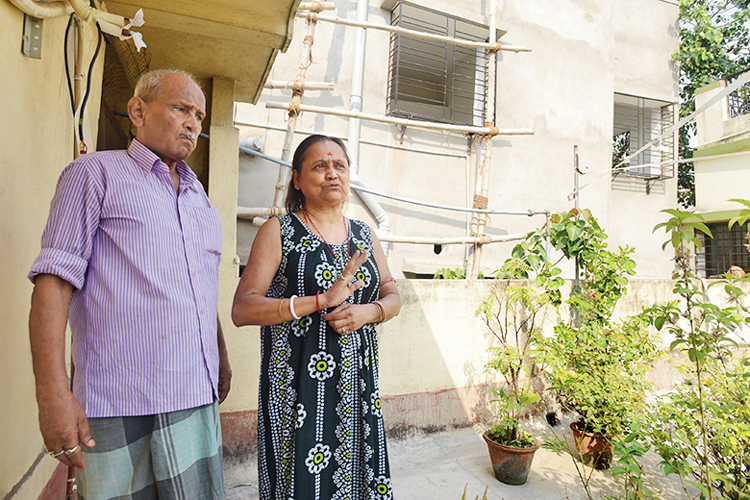 আতঙ্কের কথা শোনাচ্ছেন পাশের বাড়ির মণ্ডল দম্পতি। সোমবার, সালকিয়ায়। নিজস্ব চিত্র