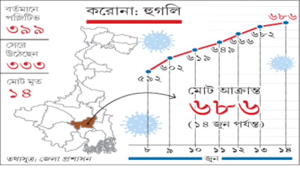 প্রশাসন সূত্রের খবর, হুগলিতে গত এক সপ্তাহে ৯৪ জন আক্রান্ত হন। শনিবারের তথ্য অনুযায়ী মোট আক্রান্তের সংখ্যা ছিল ৬৮২। রবিবার তালিকায় আরও ৪ জন যুক্ত হন। মোট আক্রান্তের মধ্যে ৩৩৩ জন সেরে গিয়েছেন। রবিবার শ্রীরামপুর শ্রমজীবী কোভিড হাসপাতালে সংক্রমিত দু’জন ভর্তি হন। গত বৃহস্পতি, শুক্র ও শনিবার ওই হাসপাতালে ৩ মহিলা-সহ ১২ জন আক্রান্ত ভর্তি হন। সেরে ওঠায় গত তিন দিনে ৩ মহিলা-সহ ১৬ জন ওই হাসপাতাল থেকে ছাড়া পেয়েছেন। তাঁদের মধ্যে ১০ জনই তারকেশ্বর ব্লকের বাসিন্দা।