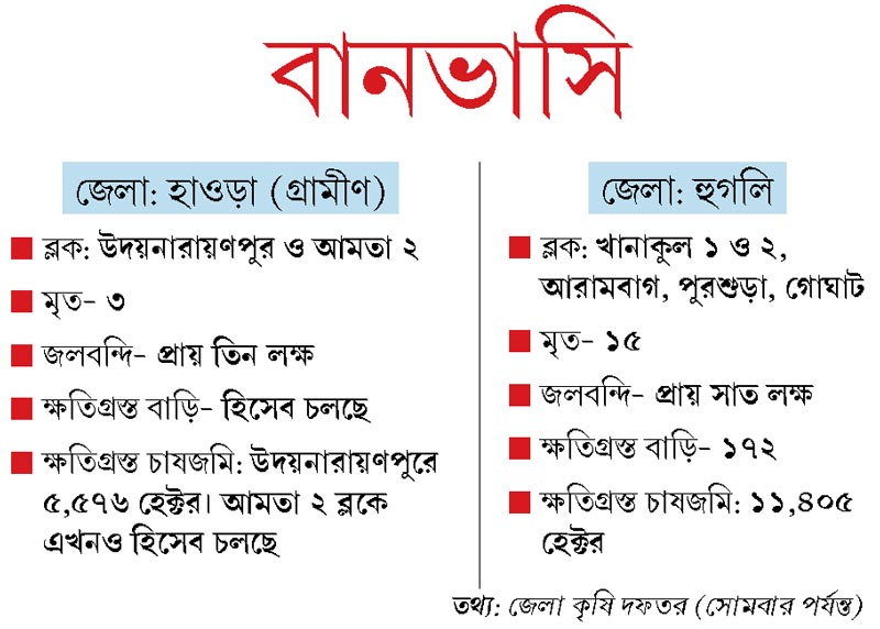 দুই জেলাতেই প্লাবনের জল নামছে। পরিস্থিতির উন্নতি হতেই শুরু হয়েছে ক্ষয়ক্ষতির হিসাব কষা। তার মধ্যে যেমন রয়েছে রাস্তা বা বাঁধ ভাঙা, তেমনই চাষ নষ্ট হওয়া। প্রশাসনের হিসেবে, উদয়নারায়ণপুরে ৫,৫৭৬ হেক্টর জমির চাষ ক্ষতিগ্রস্ত হয়েছে। ২০০০ নলকূপ নষ্ট হয়েছে। নষ্ট হয়েছে বহু বাড়ি। আমতা-২ ব্লকে ক্ষতিগ্রস্ত মানুষের সংখ্যা লক্ষাধিক। দুটি ব্লকেই সাপের উপদ্রব দেখা দিয়েছে।
