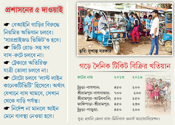 রুট ভেঙে চলা অটো, নিয়ম বহির্ভূত ভাবে ট্রেকারের ছাদে যাত্রী তোলা এবং সর্বোপরি টোটোর দৌরাত্ম্যে বাসে যাত্রী কমছে বলে দীর্ঘদিন ধরেই অভিযোগ তুলছিলেন জেলার বাস-মালিকেরা। বিষয়টি নিয়ে তাঁরা একাধিকবার প্রশাসন এবং পুলিশের হস্তক্ষেপও দাবি করেছেন। কিন্তু পরিস্থিতি বদলায়নি, উল্টে দিনের পর দিন আরও সঙ্গিন হয়েছে বলে অভিযোগ। ইতিমধ্যে বেশ কিছু রুটে বাসের সংখ্যা কমেছে। দুর্ভোগ বেড়েছে যাত্রীদের।