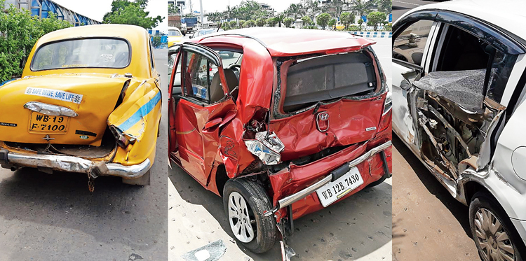 পুলিশ সূত্রে জানা গিয়েছে, বৃহস্পতিবার বেলা ১২টা ২০ নাগাদ বিদ্যাসাগর সেতুর উপরে একটি মালবোঝাই ১৪ চাকার ট্রেলার আচমকা নিয়ন্ত্রণ হারিয়ে সেটির সামনে দাঁড়িয়ে থাকা ছ’টি গাড়িকে পরপর ধাক্কা মারে। পুলিশ জানিয়েছে, ওই ট্রেলারটি প্রথমে একটি ছোট ট্রাকে ধাক্কা মারে। তার পরে একটি ট্যাক্সি, দু’টি প্রাইভেট গাড়ি এবং সব শেষে দু’টি স্কুটারে ধাক্কা মেরে ডিভাইডারের রেলিংয়ে গিয়ে পড়ে বিশালাকায় গাড়িটি। ওই ঘটনায় ছোট ট্রাকটির চালক সঞ্জিতকুমার মোদী এবং খালাসি মহম্মদ আজিমের চোট লাগে। সঞ্জিতের চোট গুরুতর বলে জানা গিয়েছে। তাঁর মাথায় চোট লেগেছে।