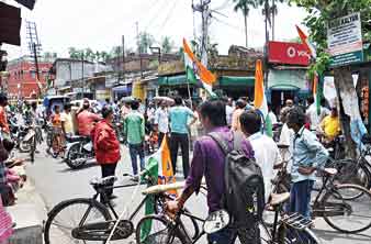 তৃণমূলের কর্মী-সমর্থকদের পথ অবরোধ। ছবি: তাপস ঘোষ।