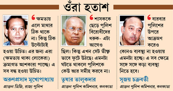 এ দিনের ঘটায় স্তম্ভিত রাজ্যের প্রাক্তন পুলিশকর্তারা। রাজ্যের প্রাক্তন ডিজি অরুণপ্রসাদ মুখোপাধ্যায়ের কথায়, ‘‘ক্ষমতায় এলে মাথার ঠিক থাকে না। এর জন্য এরা ক্রমাগত আশকারা পাচ্ছে। এ সব বন্ধ হওয়া উচিত।’’ কলকাতার প্রাক্তন পুলিশ কমিশনার তুষার তালুকদার বলেন, ‘‘পুলিশ শাসককে ছেড়ে বিরোধীদের ধরুক— এটা আগেও ছিল। কিন্তু এখন সেটা তীক্ষ্ণ ভাবে ফুটে উঠছে। এমনটা ঘটতে থাকলে পুলিশকে কেউ আর সমীহ করবে না।’’ আর এক প্রাক্তন পুলিশ কমিশনার সুজয় চক্রবর্তী মনে করেন, ‘‘বার বার পুলিশের উপরে আক্রমণ করেও কোনও ব্যবস্থা না হওয়ায় এমনটা হচ্ছে। এ সব ক্ষেত্রে সঙ্গে সঙ্গে কড়া ব্যবস্থা নিতে হবে।’’