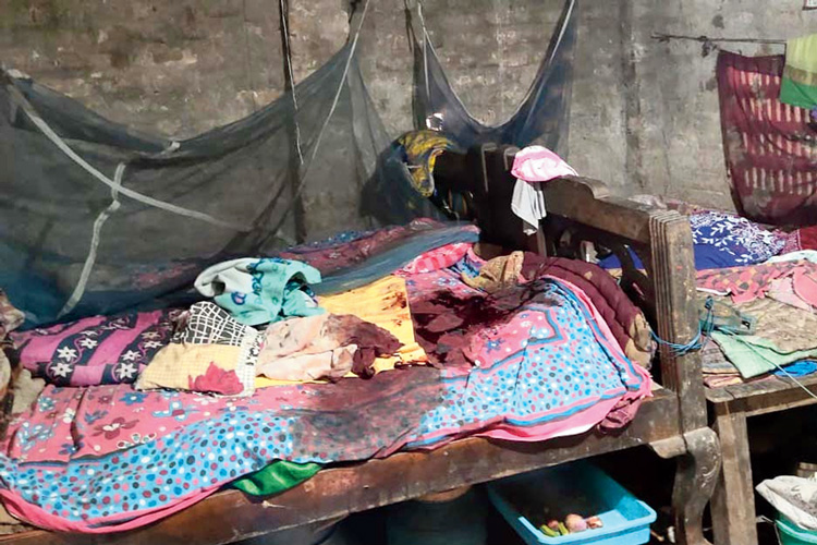 রক্তাক্ত: বিছানায় লেগে রক্ত। নিহত তারক (ইনসেটে) ছবি: সুব্রত জানা