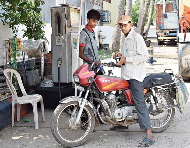 নিয়ম-ভেঙে: হেলমেট ছাড়াই তেল মিলছে পান্ডুয়ার পেট্রোল পাম্পে।