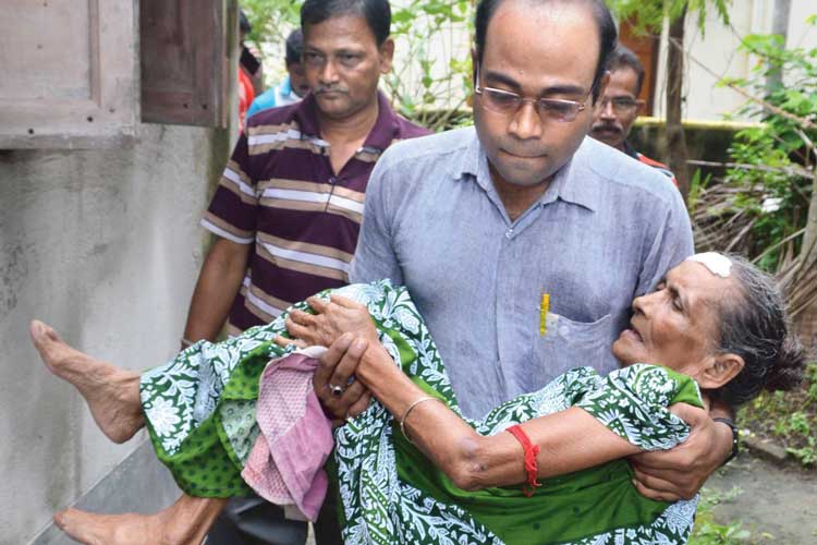 সহায়: অসীমাদেবীকে হাসপাতালে নিয়ে যাচ্ছেন পড়শিরাই। নিজস্ব চিত্র