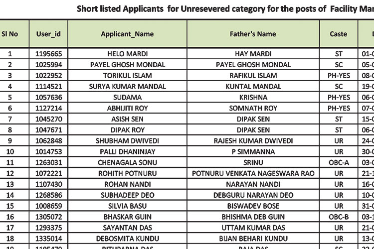 ফেসিলিটি ম্যানেজার পদে নিয়োগের জন্য বাছাই তালিকার একাংশ।