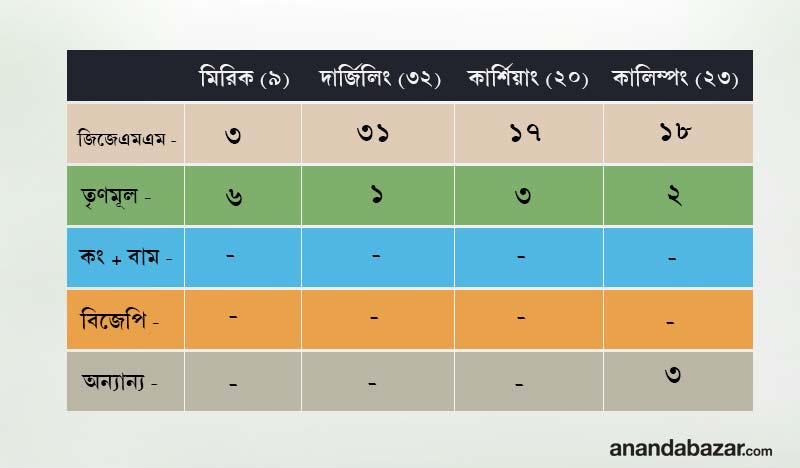 এই পুর নির্বাচন এক দিকে যেমন দেখিয়ে দিল তৃণমূলের জয়ের ধারা অব্যাহত, তেমনই চোখে আঙুল দিয়ে বুঝিয়ে দিল এ রাজ্যে বিরোধীদের কতটা দুরবস্থা। বিজেপি-ও সেই অর্থে দাঁত ফোটাতে পারেনি কোথাও। পাহাড়ে যদিও তারা প্রার্থী দেয়নি। মোর্চাকে সমর্থন করেছিল। দীর্ঘ দিন ধরে পাহাড়ের দখল নেওয়া সেই মোর্চাও এ বার তৃণমূলের কাছে কিছুটা নাস্তানাবুদ। পাহাড়ের চারটি পুরসভার প্রতিটিতেই খাতা খুলেছে তারা। শুধু তাই নয়, মিরিকের মতো একদা মোর্চা-গড়কেও তারা নিজেদের দখলে নিয়ে এসেছে। অন্য দিকে, সমতলের তিন পুরসভাতেই বোর্ড গঠন করছে তৃণমূল।