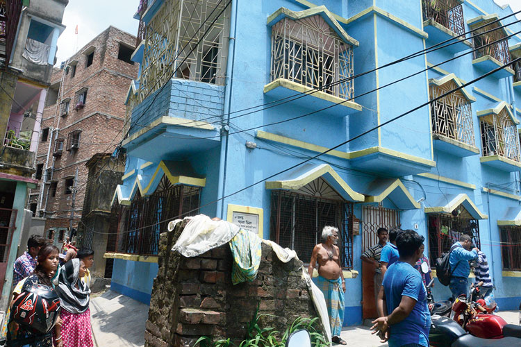 বাড়ির সামনে ভিড় স্থানীয় বাসিন্দাদের। শনিবার, বাজে শিবপুরে। ছবি: দীপঙ্কর মজুমদার