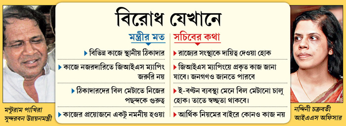 এর আগে সুন্দরবন উন্নয়ন দফতরে নানা দুর্নীতির অভিযোগ ওঠায় ২০১২ সালের শেষের দিকে মন্ত্রী শ্যামল মণ্ডলকে সরিয়ে দেন মুখ্যমন্ত্রী। দায়িত্ব পান দক্ষিণ ২৪ পরগনার কাকদ্বীপের বিধায়ক মন্টুরাম পাখিরা। কিন্তু দু’বছরের মধ্যে তাঁর কাজকর্ম ঘিরেও নানা দুর্নীতির অভিযোগ উঠতে শুরু করে। সুন্দরবন উন্নয়ন দফতর নিয়মিত তিনটি কাজ করে। খাঁড়ি-ঘেরা সুন্দরবন এলাকায় বাঁধ ও রাস্তা তৈরি, মি‌ষ্টি জলের নলকূপ বসানো ও পুকুর কাটা এবং ম্যানগ্রোভ গাছ লাগানো। এর মধ্যে ম্যানগ্রোভ গাছ লাগানো নিয়ে স্থানীয় জনপ্রতিনিধিদের তরফেই নানা দুর্নীতির অভিযোগ উঠতে থাকে। ওই দুর্নীতি বন্ধেই নন্দিনী জিওগ্রাফিকাল ইনফরমেশন সিস্টেম (জিআইএস বা উপগ্রহের মাধ্যমে ধরা চিত্র)-এর মাধ্যমে গাছ লাগানোর উপরে নজরদারির নির্দেশ দেন। দফতর সূত্রের খবর, সচিবের এই নির্দেশেই চটে যান মন্ত্রী। তিনি জানিয়ে দেন, এ ভাবে কখনওই গাছ লাগানোর উপরে নজরদারি সম্ভব নয়। কারণ, জিআইএস ইমেজে সব ধরা পড়ে না। যদিও সচিবকে সমর্থন করেন শাসক দলেরই স্থানীয় বিধায়ক তথা সুন্দরবন বোর্ডের সদস্য বঙ্কিম হাজরা, সমীর জানারা।