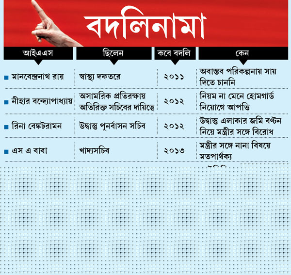 একই ভাবে খাদ্যমন্ত্রী জ্যোতিপ্রিয় মল্লিকের সঙ্গে মতবিরোধের জেরে সচিব সৈয়দ আহমেদ বাবা, অর্থমন্ত্রী অমিত মিত্রের সঙ্গে মন কষাকষির জন্য চঞ্চলমল বাচোয়াতের মতো অফিসারদের সরিয়ে দিয়েছেন মুখ্যমন্ত্রী।